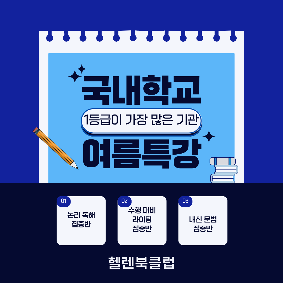 📌 왜 헬렌북클럽 여름특강일까요?✔️ 국내학교 학생 1등급이 가장 많은 기관✔️ 논리 독해력부터 내신과 수행 라이팅까지 한번에!