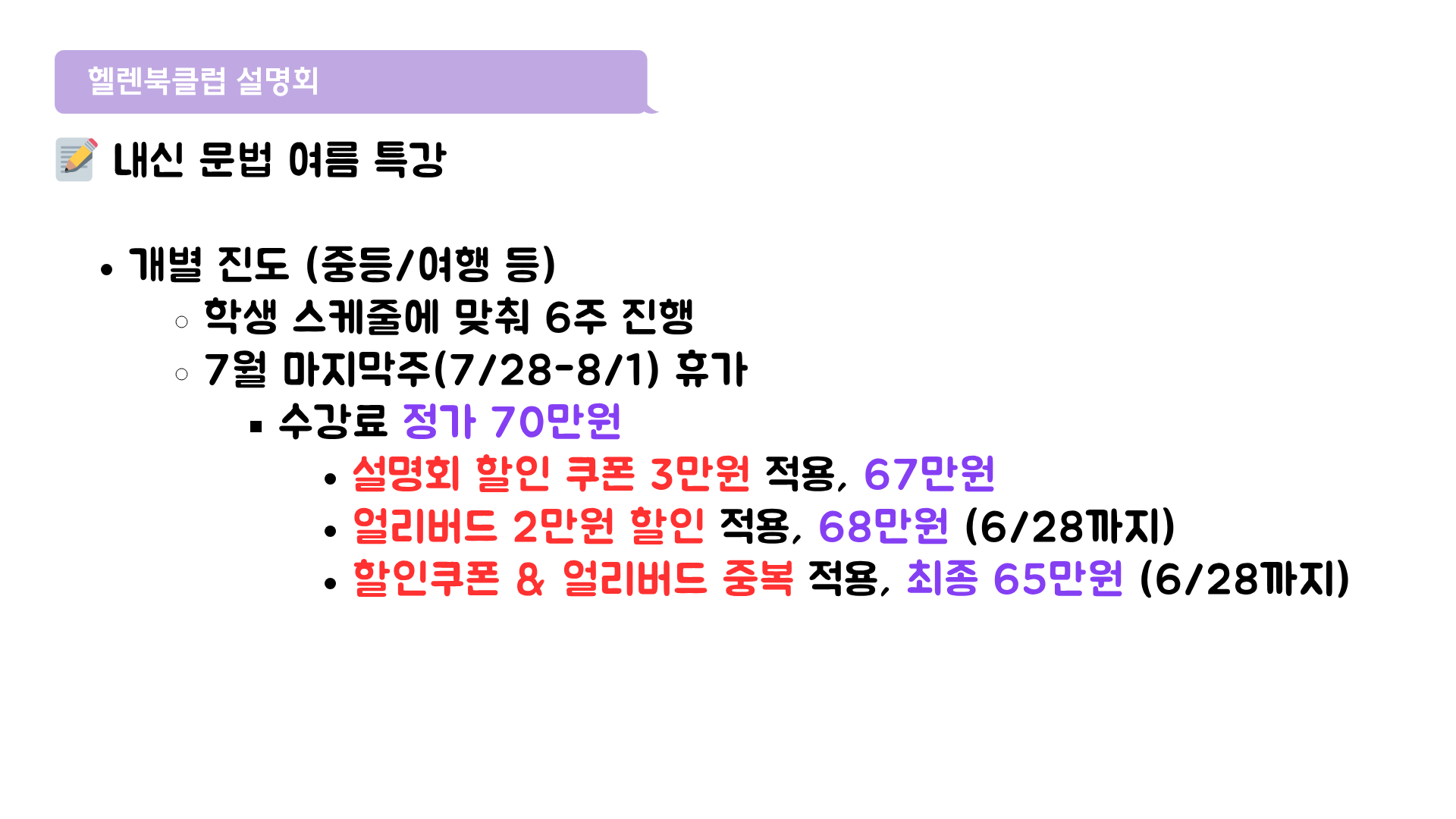 "우리 아이, 방학 동안 어떻게 공부시킬까?" 🤔방학은 짧은데, 내신 준비에 수행평가까지 걱정이 많으시죠?헬렌북클럽이 그런 고민을 해결하기 위한 여름특강을 준비했습니다!
