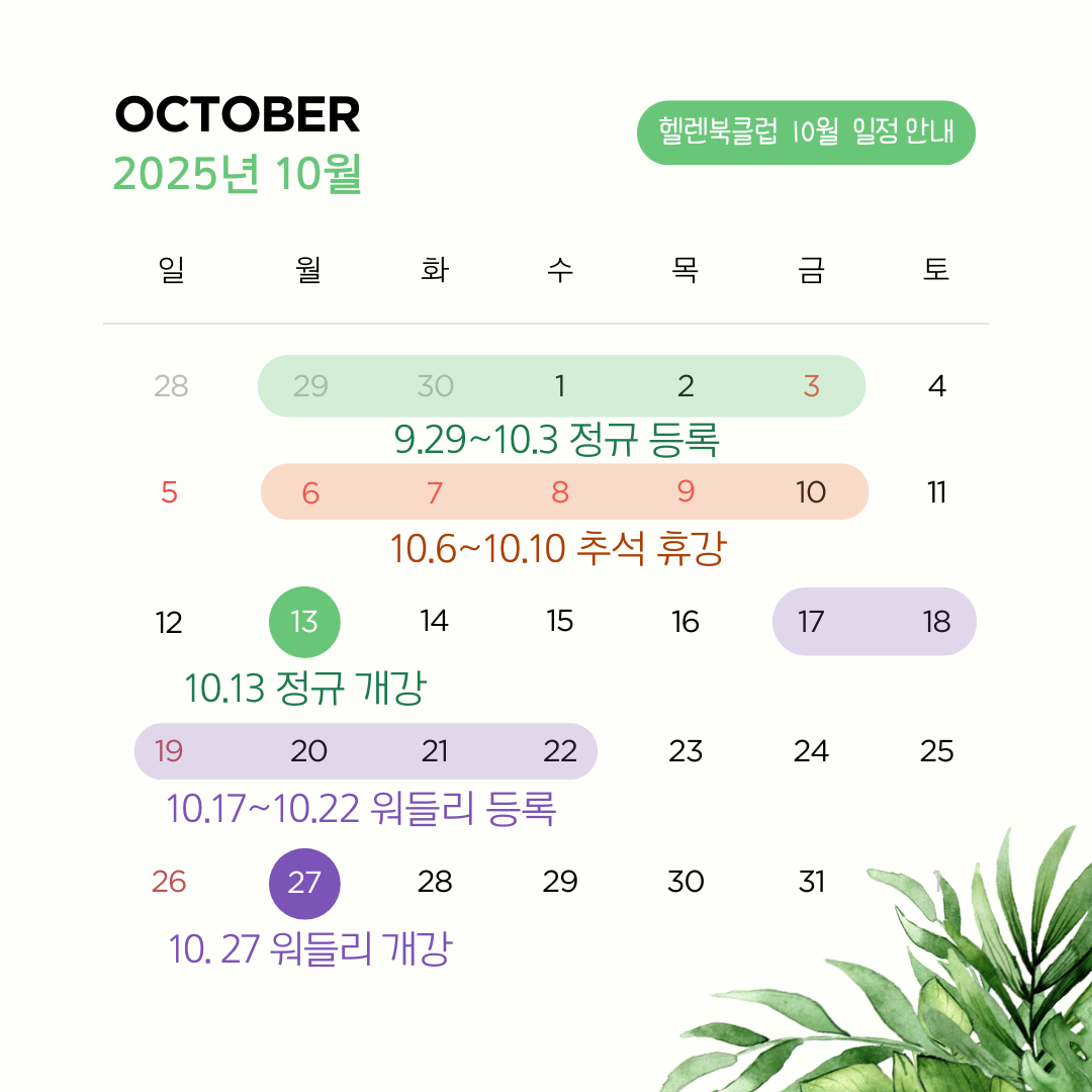 🌿✨ [10월] 헬렌 북클럽 정규 / 워들리와이즈 세션 오픈일정 ✨🌿